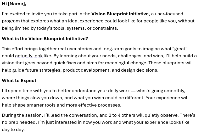 To make research scalable, I developed a standardized research outreach template for recruiting agents, streamlining scheduling, and ensuring consistent insights across sessions.
