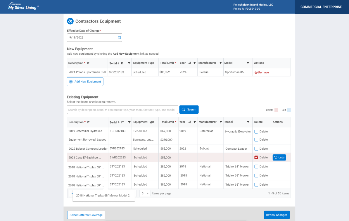 Streamlining complex policy changes for faster agent and underwriter workflows at West Bend Insurance Company. This redesign focused on improving speed, reducing redundant manual entry, and increasing clarity for both underwriters and agents handling changes like adding equipment, adjusting limits, or managing loss payees.
