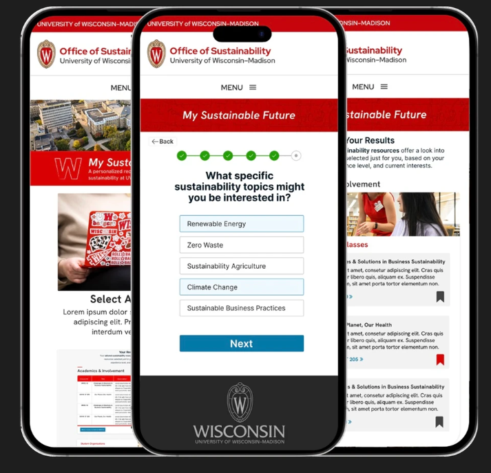 A personalized recommendation tool for all things sustainability at UW-Madison. Collaborated with other students in the student organization Design Interactive while partnering with the UW-Madison Office of Sustainability to design an app that helps students personalize their campus sustainability journey.