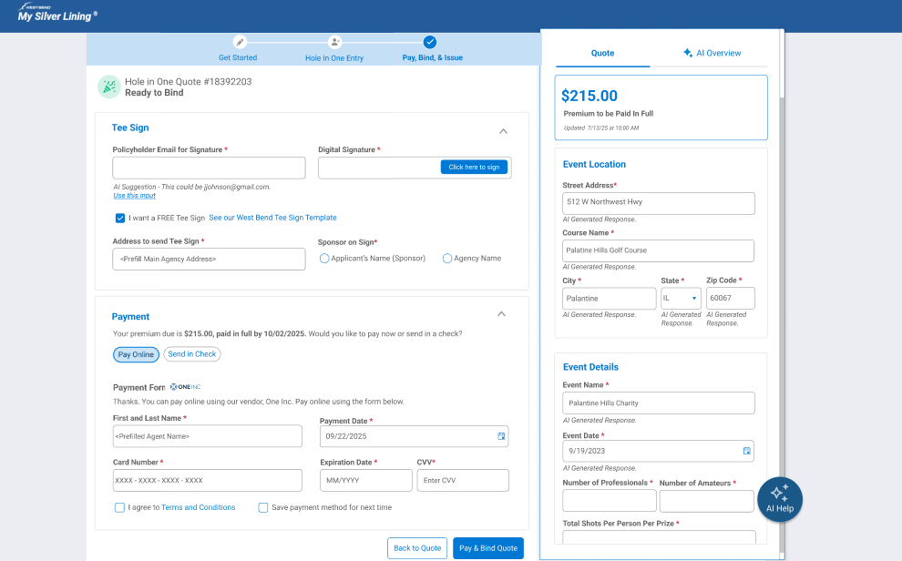 This case study explores how an AI chat assistant was embedded directly into the Hole in One quoting experience to reduce agent friction, improve accuracy, and increase confidence throughout the entire flow. Rather than introducing AI as a standalone tool, the goal was to design it as a continuous support layer that adapts to the agent’s progress and provides guidance exactly when it is needed.