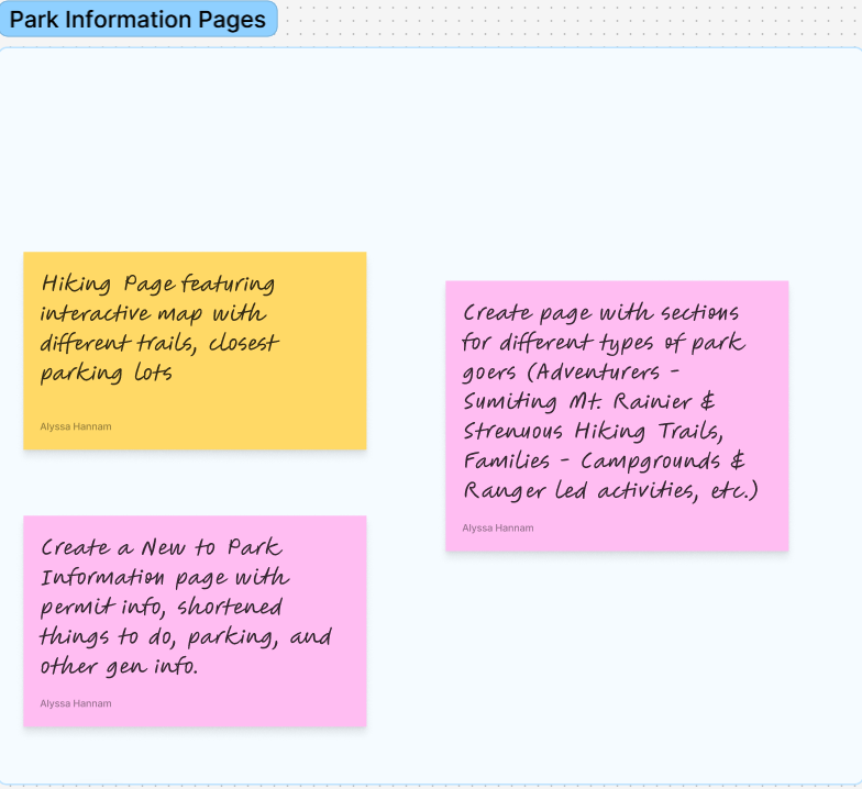 Using FigJam, I brainstormed over 24 ideas with color-coded Post-its and used laddering to map different user needs, from finding key park details and getting weather alerts to improving the overall visitor experience.