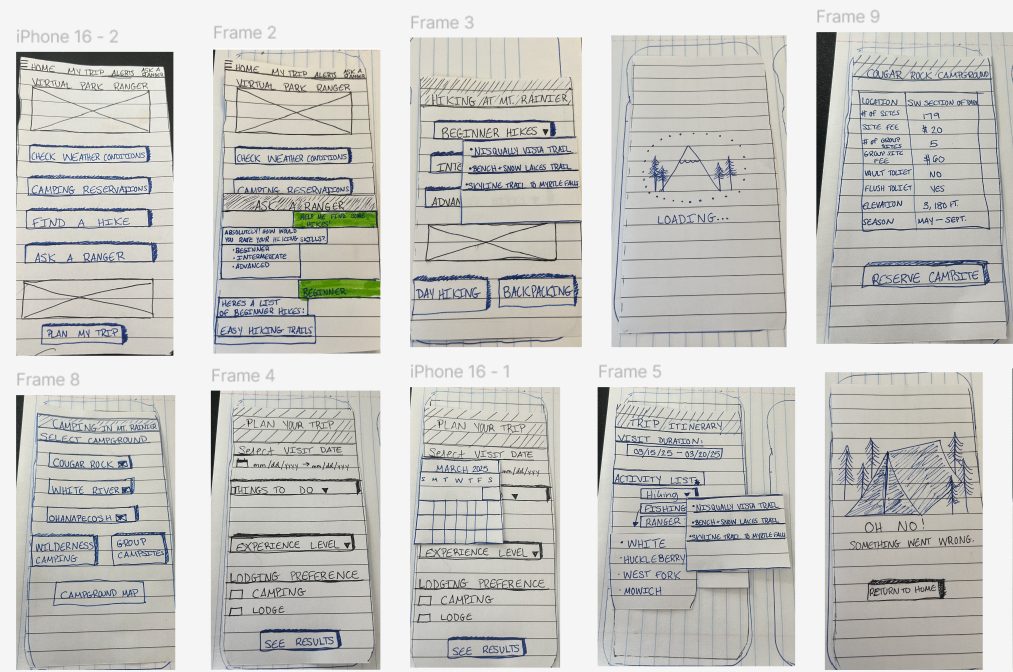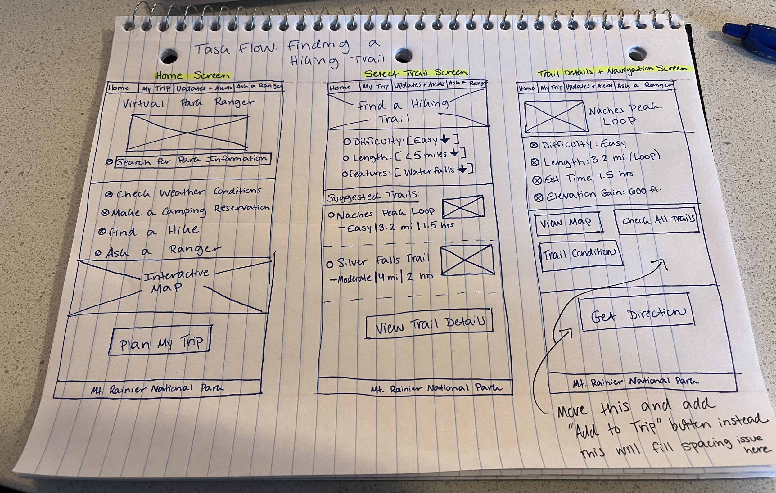 Using this paper prototype, I mapped out and fine-tuned the flow for helping users discover hikes at Mt. Rainier with the AI Ranger.