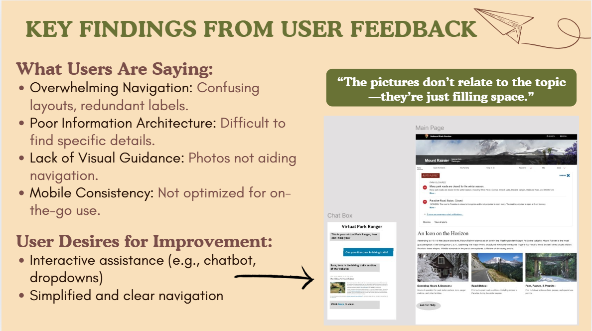 Building on insights from earlier user interviews, I created a survey to better understand common pain points on the Mt. Rainier website. The results showed that while users could usually find the information they needed, the process was slowed by page clutter, unclear categorization, and repeated content. Many also felt the homepage was overwhelming and inconsistent in design, making navigation harder and the site feel less polished than other National Park websites.