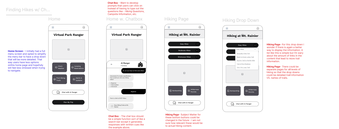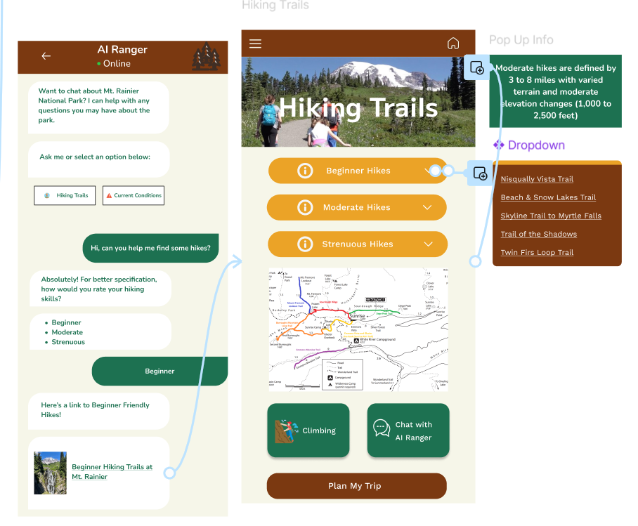 Here's the rough draft that sets it all in motion: a low-fi wireframe with notes mapping the flow of discovering hikes at Mt. Rainier with the AI Ranger.