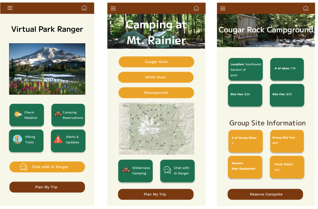 Storyboard lays out a first-time visitor’s journey through planning their trip to Mt. Rainier utilizing the AI Park Ranger.
