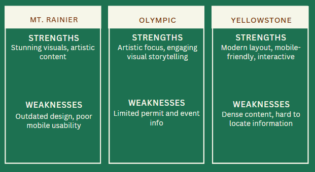 I conducted a comparitive analysis of two other National Park websites—Yellowstone and Olympic National Park—to identify commonalities and areas where these websites outperform the current Mt. Rainier site. This analysis also allowed me to pinpoint the strengths of Mt. Rainier’s website.