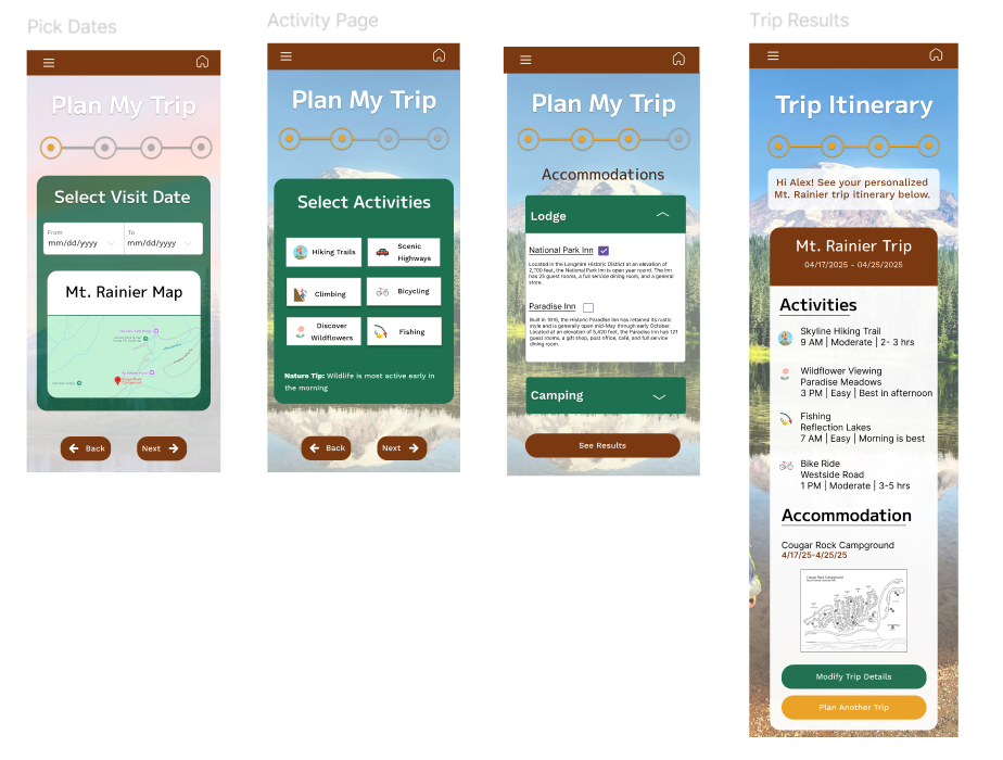 This project was a great learning experience. At first, I struggled to define the vision, especially with the Plan Your Trip section. Paper prototypes played a huge role in figuring out the flow. Sketching allowed me to be messy and free, which helped me refine the experience once I moved to the digital version. Through user feedback, I realized the app would be most valuable to those who had never visited a National Park. They saw how much it would help with trip planning. Experienced park-goers liked the AI feature, but didn’t feel it was essential for their own planning. Working through these iterations, I was able to finalize the flow with a user-centered focus.